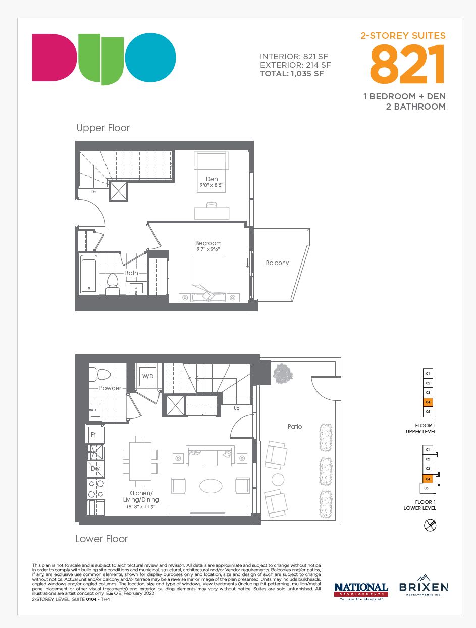 Fantastic Living In The Brand New Duo Condos. This Two Storey Townhome is 821 sq ft 1 Bed + Den with a 214 sq ft Patio/Balcony. Featuring 9' ceiling, wide plank HP Laminate Floors, Designer Cabinetry, Quartz Counters, Back splash, Stainless Steel Appliances. Amazing Amenities ready for immediate Use. Rooftop Patio with Dining, BBQ, Garden, Recreation & Sun Cabanas. Party Room with Chefs Kitchen, Social Lounge and Dining. Fitness Centre, Yoga, Kid's Play Room, Co- Work Hub, Meeting Room. Be in one the best neighbourhoods in Brampton, steps away from the Gateway Terminal and the Future Home of the LRT. Steps to Sheridan College, close to Major Hwys, Parks, Golf and Shopping.