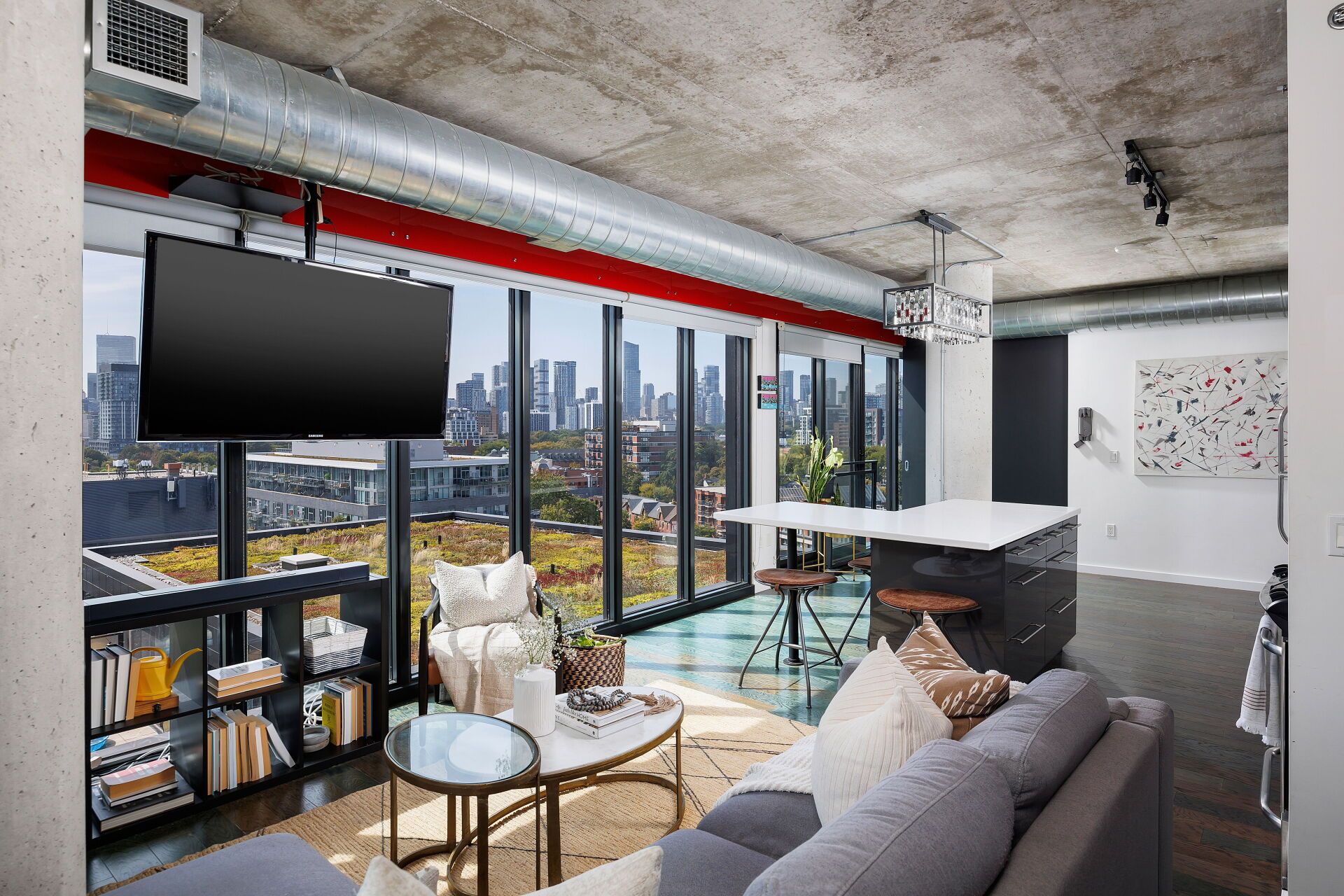 This 2 bed, 2 bath corner loft (1000 sq. ft.) is all about light, style, and skyline. With exposed concrete, 9 ft. ceilings, and south west facing floor-to-ceiling windows, every room is drenched in natural light and framed by epic city views. 4 balconies (incl. 3 juliettes) extend your living space and bring the outdoors in. Open concept kitchen features a sleek white glass backsplash, stainless steel appliances, and a custom island - perfect for entertaining and everyday living. Ideal split bedroom layout offers 2 generous bedrooms, updated baths, plus tons of built in storage. The second bedroom has fabulous black glass closets, ideal as a full bedroom, home office, or open it up as a den. Extras include parking and ensuite laundry (new washer&dryer). LEED certified building boasts top tier amenities: gym, outdoor pool, BBQ area, and stylish party room. Minutes to Corktown Common, the Distillery District, Leslieville, and St. Lawrence Market. Steps from shops, restaurants, parks, and TTC with easy access to the DVP and Gardiner. Bright, functional, modern, with a view you'll love.