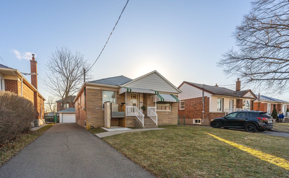 Welcome to this lovingly maintained 3+1 bedroom, 2 bathroom detached bungalow, proudly cared for by the same owners for over 60 years. A covered porch and updated walkway lead to the home, offering parking for 6+ cars plus a detached 1-car garage with automatic door opener. Major updates include shingles: House (May 2022), Garage (June 2020), eavestroughs, soffits, gutter guards, a newer furnace (October 2017), AC (August 2024), and rental HWT (2024). Inside, the main level features gleaming hardwood floors (excluding kitchen and bath) and a large front closet. Double thermopane front windows add comfort and quiet. The spacious living room includes crown moulding and a picture window overlooking the front yard and flows into the dining room, which connects to the bright eat-in kitchen. Three well-sized bedrooms-each with hardwood and ample closets-complete this level, with the third bedroom offering a walkout to the entertainer's deck and generous backyard. The updated 4-piece bath includes a walk-in tub/shower for improved accessibility. An electric chair lift is currently installed at the front entrance of the home. A convenient side entrance leads to both the main level and the finished basement, perfect for extended family or additional living space. The lower level features a large rec room, separate wet bar, eat-in kitchen, bedroom, bathroom, and abundant storage. Ideally located within walking distance to shopping, groceries, parks, places of worship, and transit, with quick access to major highways for easy commuting.
