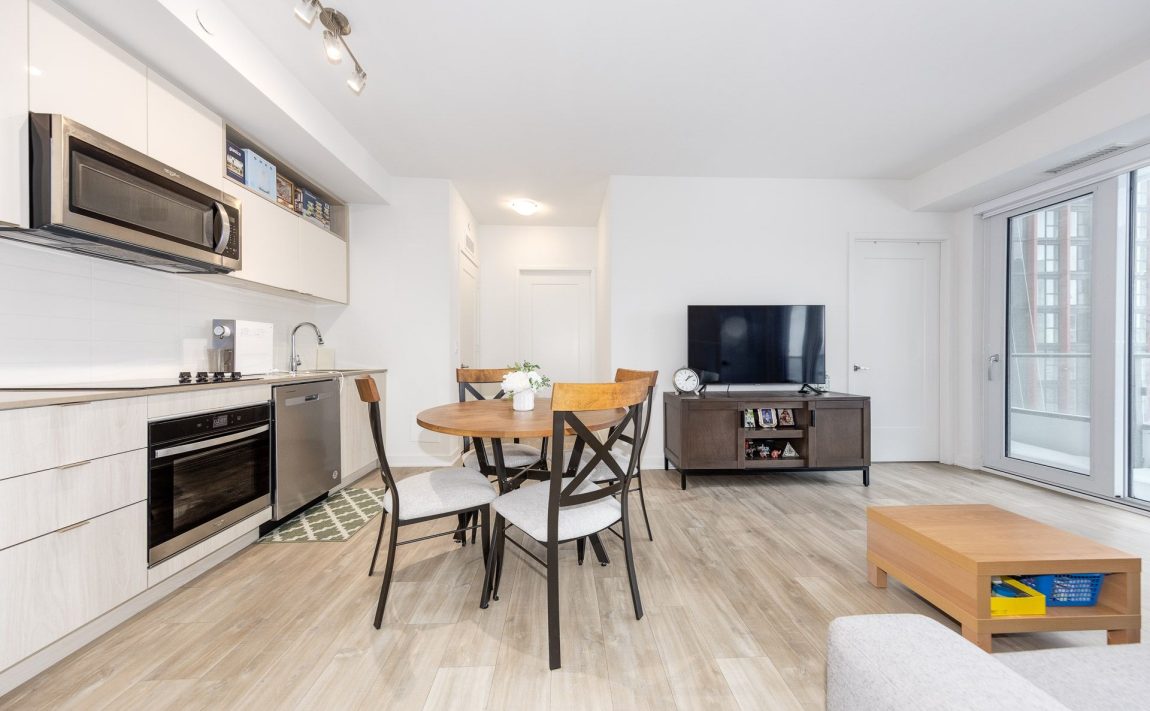 Discover Time & Space Condos, another master-planned community completed by The Pemberton Group in 2024. This bright 2-bedroom + den, 2-bathroom suite features 9-foot smooth ceilings, large floor-to-ceiling windows with custom roller blinds, and a spacious walk-out balcony. Features a fully equipped kitchen with built-in stainless steel appliances (refrigerator, glass stovetop, oven, microwave/hood, dishwasher). Full-size in-suite washer and dryer. Residents have access to five-star amenities: A Well-Equipped Fitness Center, & Yoga Studio An Outdoor Infinity-Edge Pool With Private Cabanas And a Tanning Deck, Outdoor Dining Areas With BBQ Facilities A Theatre/Media Room, Games Room, and Party Room, Outdoor Terraces On Various Floors For Relaxation And City Views, A 24-hour Concierge Service For Convenience And Security. Perfectly positioned in the heart of Toronto's most recognizable historic neighborhoods, a short walk to major attractions, schools (U of T, TMU and George Brown), shops, restaurants, and cafes (St. Lawrence Market, Distillery District, Sugar Beach, Union Station and PATH, Berzcy Park, etc.). Convenient access to grocery store across the street. City bikes located just outside of the main entrance.