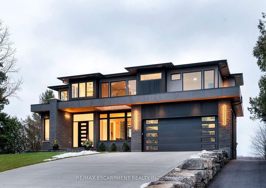 Incredible one year old modern home. 4650 sq ft of above grade living space, with 1700 sg ft finished walk up basement. Enjoy the beautiful views of the Escarpment and Lake Ontario, backing on to the Bruce trail and farm land. Five bedrooms all with ensuites, a Nanny suite with separate entrance. Three extra powder rooms (total. 8 bathrooms, 5 bedrooms) for convenience. Take in beautiful sunrises from the east and watch breathtaking sunsets in the west. from this one acre lot. This home has been designed with ease of living, allowing 22 parking spots on this one acre lot. The back yard has plenty of space to design your own oasis. Convenient country living on Burlington's prestigious #1 sideroad, only minutes away from all amenities. Luxury Certified.