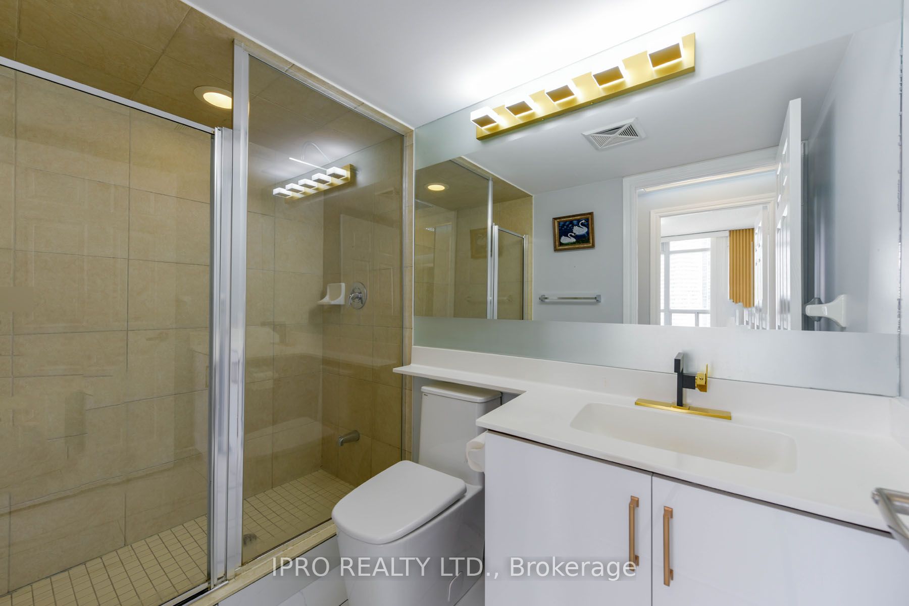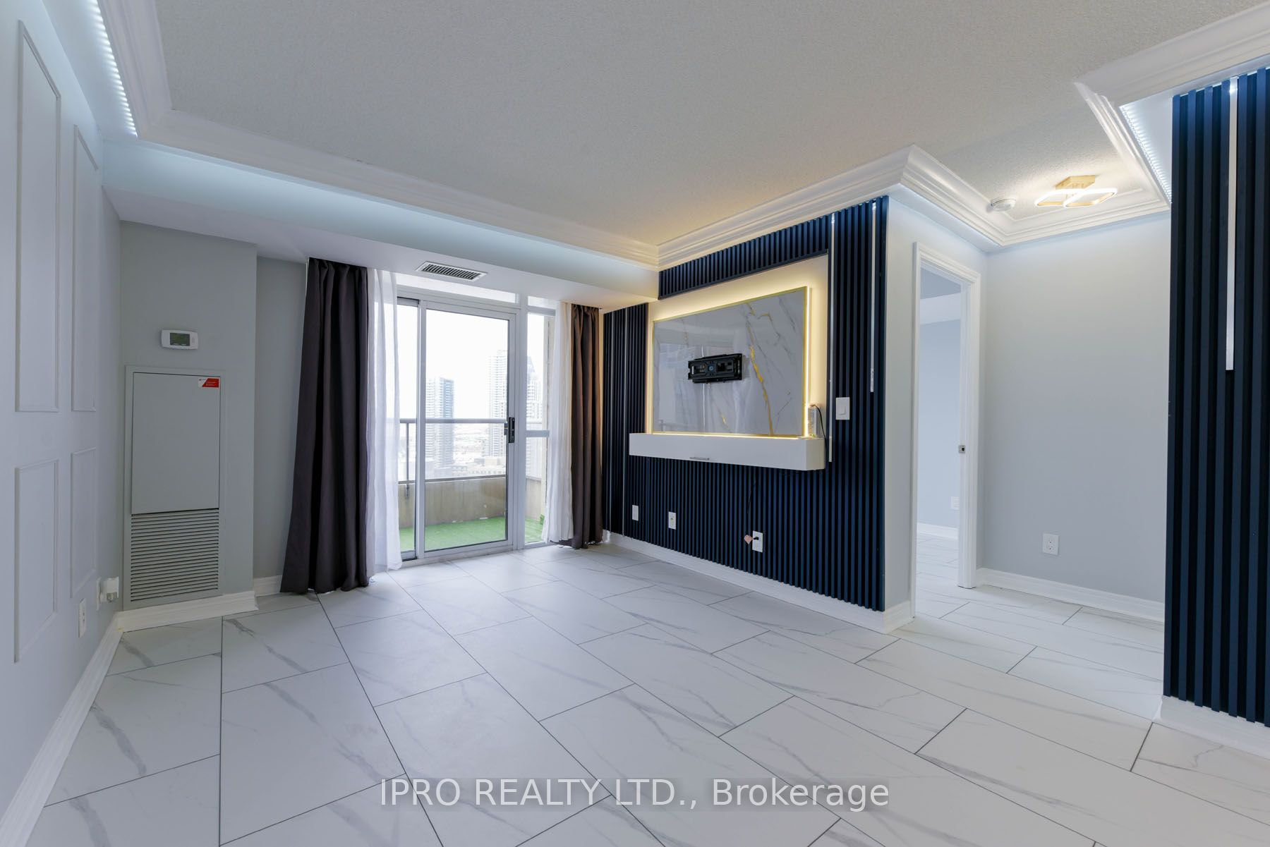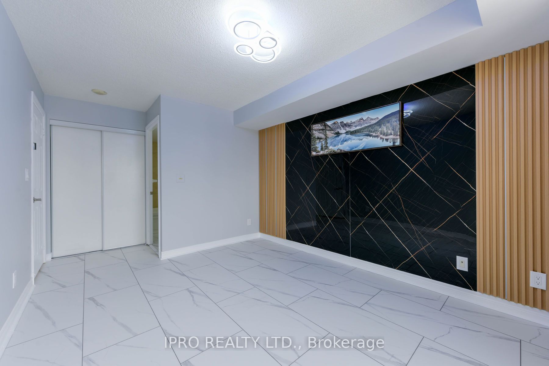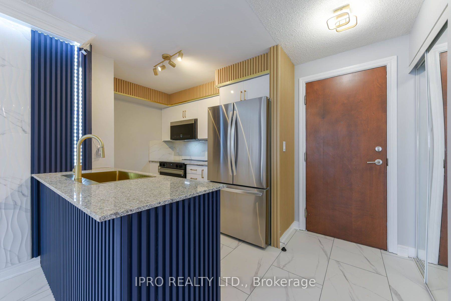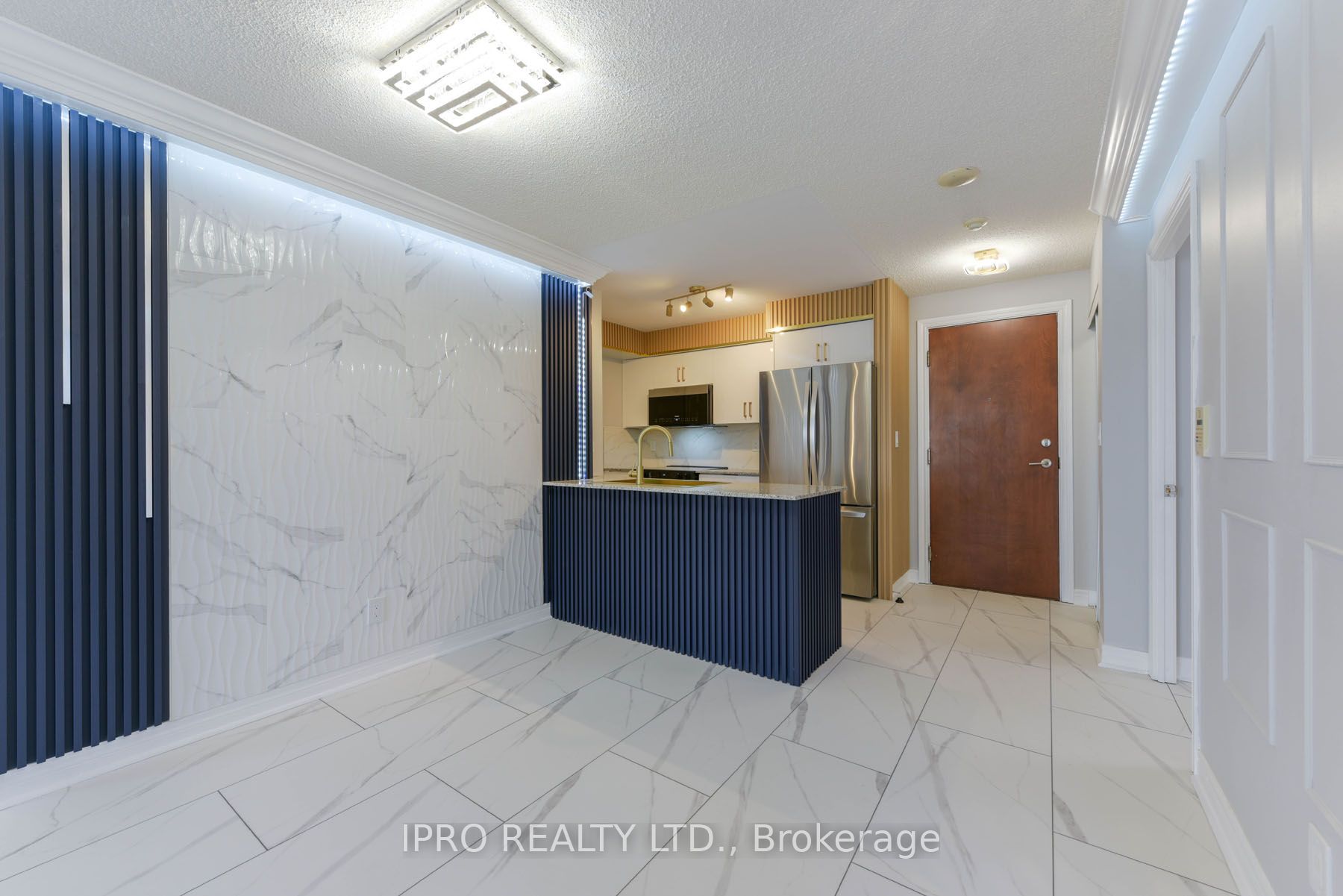 "Seeing-is-Believing"!!! Masterfully renovated to highest standards. No detail has been left unattended. New marble-look vinyl flooring throughout. LIVING/DINING: Crown moulding all around with remote-controlled diffused LED lighting for relaxing ambiance. Textured marble-look accent wall to the right, wainscotting encrusted wall to the left. A specially designed TV wall-panel surrounded by LED strip lighting with built-in console and full motion TV mount and navy blue fluted panels. KITCHEN: Brand new white melamine kitchen cabinets with soft-close doors, elegant golden handles and under-cabinet motion sensor lights. All new high-end LG/Samsung major appliances, over the range Panasonic microwave with built-in exhaust. Large modern rectangular gold-look metal kitchen sink with golden gooseneck faucet. Faux wood fluted panels along the ceiling and right wall. PRIMARY BEDROOM: Artistic head-board wall has black granite-look panel in the middle with fluted panels on either side, walk-in closet with cupboard. Attached ensuite washroom has moulded one-piece toilet and gold accent sink faucet. 2nd BEDROOM: Has fluted side panels and marble-look panel under the window. DEN: (a separate room) : has backwall with part fluted panels and part black granite look panel. MAIN WASHROOM: Has white quartz vanity with gold/black designer faucet, molded one-piece toilet, 2 towel bars and a glass enclosed shower stall. All 3 bedrooms have exquisite LED ceiling lights with remote controls.