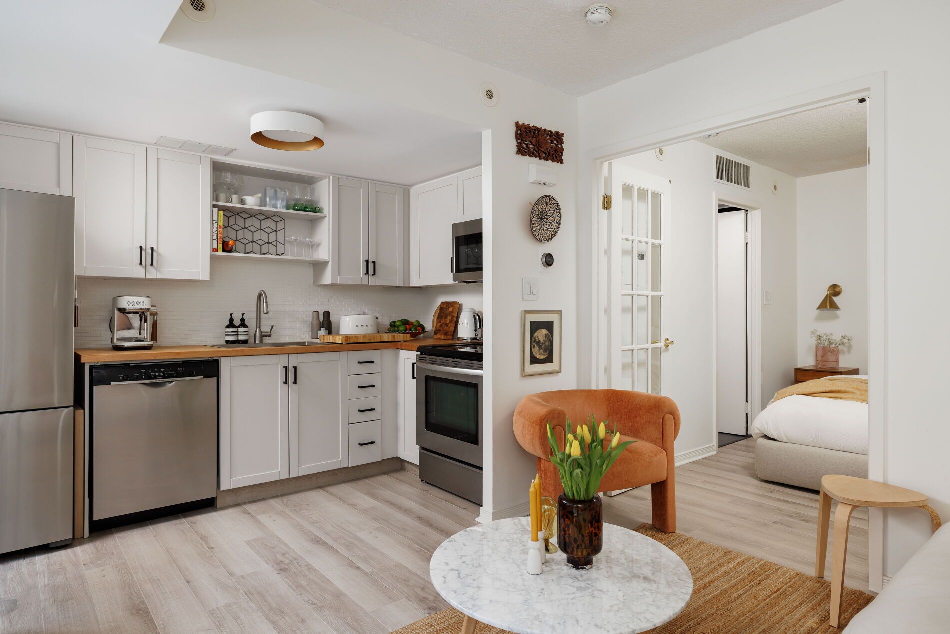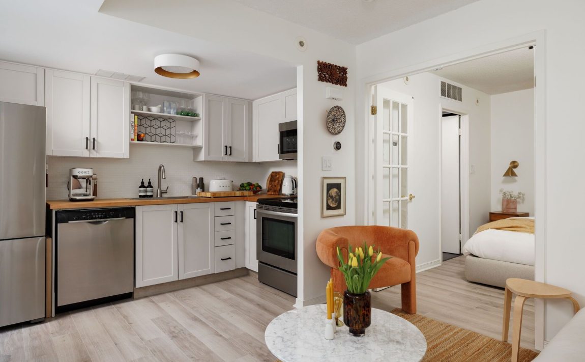 Welcome to your perfect slice of city living in the heart of Liberty Village! This charming one-bedroom, ground-level townhome offers the kind of convenience and character that's hard to find-your own private entrance means no elevators, just easy walk-up access to a bright, beautifully designed space that instantly feels like home.Flooded with natural light from west-facing windows and elevated above grade for added privacy, this thoughtfully laid-out suite makes the most of every inch. The open-concept living and dining area flows effortlessly into a stylish, updated kitchen featuring stainless steel appliances, a butcher block countertop, and plenty of storage-ideal for both everyday living and hosting friends.The bedroom is equally inviting, complete with elegant French doors, generous closet space, and easy access to a sleek 4-piece bathroom. You'll also love the in-suite laundry, spacious wardrobe, partial walk-in closet, and dedicated storage locker-because smart living is all about smart storage.Tucked into a beautifully landscaped enclave, this home offers a peaceful retreat just steps from everything that makes Liberty Village so vibrant-trendy cafés, top-rated restaurants, local boutiques, parks, and easy transit access along King West.With low maintenance fees and a move-in-ready interior full of warmth and personality, this is a rare opportunity for first-time buyers, savvy investors, or anyone dreaming of a stylish downtown pied-à -terre with true character.