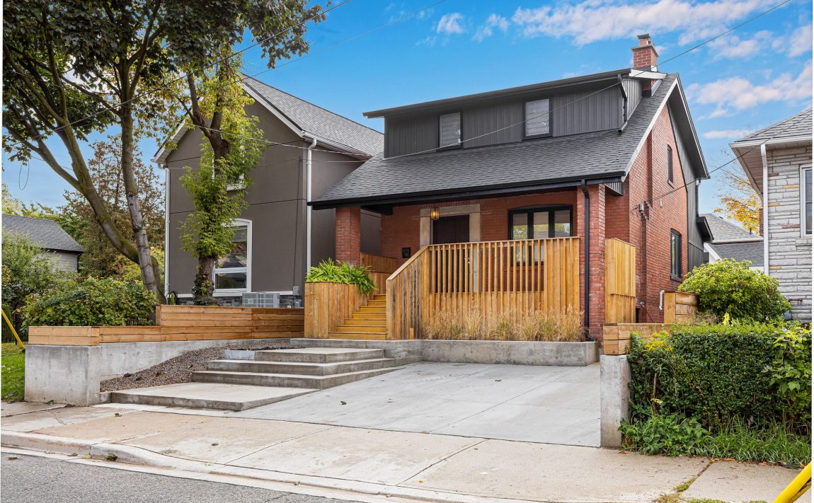 Modern Mimico Living by the Lake. Architectural gem in heart of coveted lakeside enclave. Extraordinary residence offers rare combination of main home, modern coach house, loft, garden space, private parking. Thoughtfully designed for multi-generational living/sophisticated live-work opportunity. Every detail executed w artistry and precision. Recently renovated over 2,200 sq. ft. beautifully finished living space. Home features all-new electrical, plumbing, mechanical, structural systems. Custom Bauhaus windows/doors flood interior w natural light, soaring ceilings, warm wood, sculptural layers of concrete and tile. Open concept main level flows seamlessly through expansive windows to private deck w lush garden. Heart is chef's kitchen anchored by impressive 8-foot island and premium Miele appliances. Private main-floor salon w decorative fireplace and powder room offer versatile retreat -ideal reading room, home office, or intimate gathering space. Striking sculptural white oak staircase, dramatic vertical window, lead to upper level w bedrooms featuring custom rift-cut white oak cabinetry, complemented by spa-inspired bathroom with rain shower, antique clawfoot tub, double vanity, private water closet - All a sanctuary of quiet luxury. Lower level adds exceptional flexible self-contained studio complete w kitchen and bath -perfect for extended family, guests, teens, or creative workspace. Unique appeal is a 600 sq. ft. modern coach house w soaring 15-foot ceilings, loft, full-width accordion glass doors that blur line between indoors and out. Heat pump for year-round comfort and running water make a remarkable space ideal as atelier, studio, retreat, or inspiring separate work environment. Located on quiet tree-lined one-way street minutes from waterfront, parks, schools, transit, neighbourhood favourites include Birds & Beans Cafe,San Remo Bakery, and Mildenhall Montessori School. This exceptional property delivers a perfect blend of design, lifestyle, location.