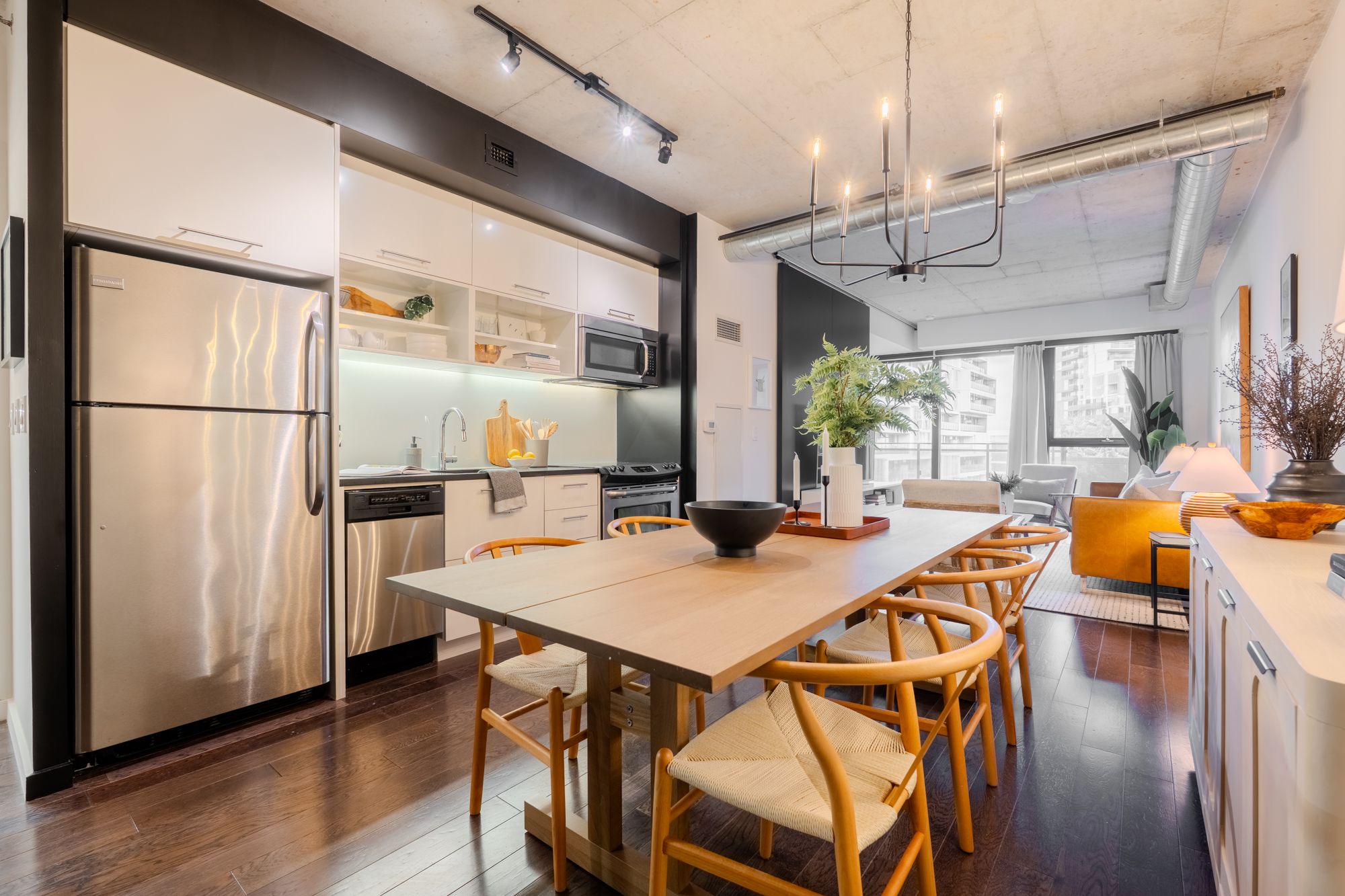A thoughtfully designed loft-style residence that delivers exceptional flexibility, natural flow, and a lifestyle-forward setting in the heart of the Canary District. This open-concept one-bedroom plus den offers a rare level of versatility, with a generously sized den that comfortably functions as a true second bedroom. A collapsible wall allows the space to open seamlessly for entertaining or close off for privacy, work-from-home needs, or guests. Concrete ceilings and warm hardwood floors create a modern, architectural backdrop, while the kitchen integrates effortlessly with the living and dining areas for everyday ease and hosting alike. Storage is both abundant and intentionally planned, highlighted by an oversized walk-in closet located in the front hall, making it ideal as additional storage for a second bedroom or den setup. The semi-ensuite, dual-access bathroom is complemented by extended cabinetry and linen storage above a brand new washer/dryer combo (2025) for added functionality. Step outside to an open balcony overlooking the landscaped courtyard and outdoor pool, offering a resort-like atmosphere that truly shines in the warmer months. Surrounded by some of downtown Toronto's most thoughtfully planned green space, including the expansive Corktown Commons just steps away, perfect for morning walks, sunset runs, or relaxed afternoons outdoors. Enjoy downtown living without the chaos, while in close proximity to the Distillery District, St. Lawrence Market, Riverside, and Leslieville, with easy TTC access to King and Queen streetcars and seamless connectivity to the DVP, Lakeshore, and Bayview Extension. Everyday conveniences abound, from parks and trails to fitness centres, grocery options, dog-friendly cafes, and standout dining destinations such as The Broadview Hotel rooftop. A well-managed building with 24/7 security and impeccably maintained common areas completes the offering - a refined, flexible home designed for modern urban living.