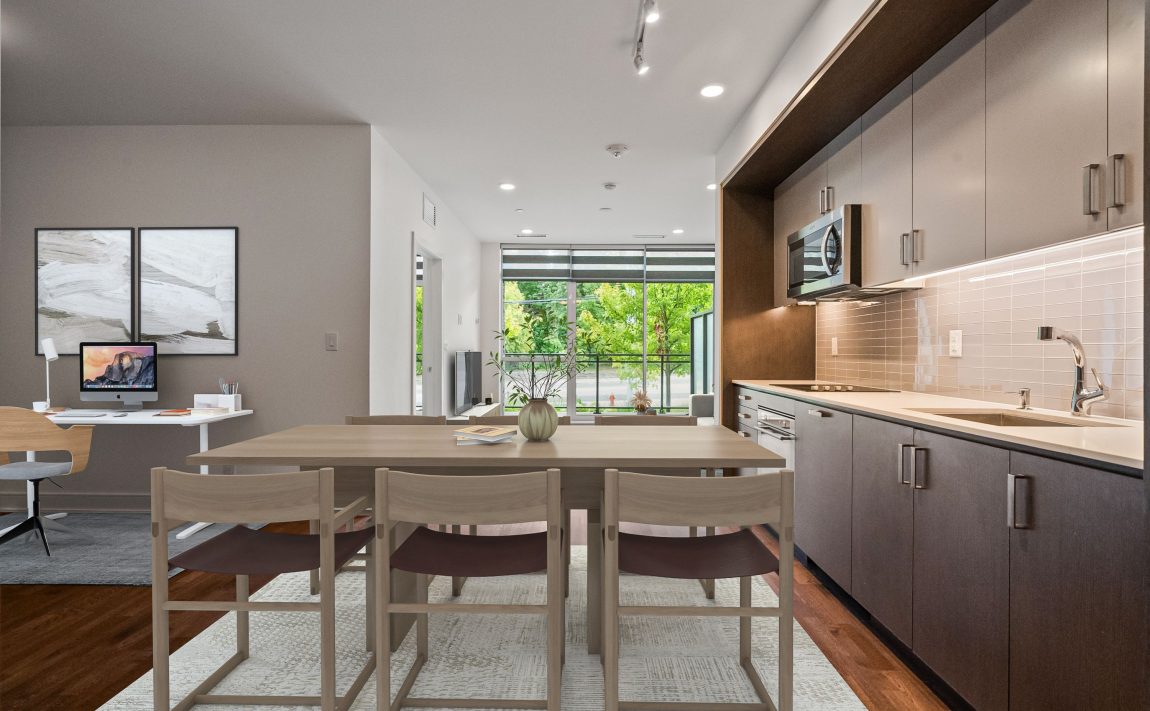 Welcome to the sought-after Oak Park model in The Craftsman Condos, located in the heart of Clarkson Village. This bright ground-level suite offers approximately 660 sq. ft. of open-concept living, featuring 1 bedroom plus a spacious den suitable for a dining area, home office, or guest space. The unit features 9-ft ceilings, hardwood flooring, and floor-to-ceiling windows providing abundant natural light, with a walk-out to a private terrace overlooking the landscaped garden. The modern kitchen is equipped with two-tone cabinetry, quartz countertops, stainless steel appliances, and a contemporary backsplash. Additional features include heated bathroom floors, custom window coverings, in-suite full-sized laundry, and smart thermostat (Google Nest V3). Generous closet space throughout. Includes one oversized parking space with private EV charger and convenient access for larger vehicles.Building amenities include 24-hour concierge, fitness and yoga studio, rooftop terrace, landscaped courtyard, party room, and guest suite. Ideally located close to parks, waterfront trails, shopping, restaurants, public transit, and minutes to Clarkson GO Station and QEW.