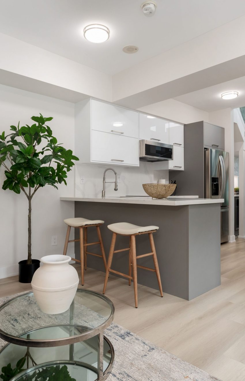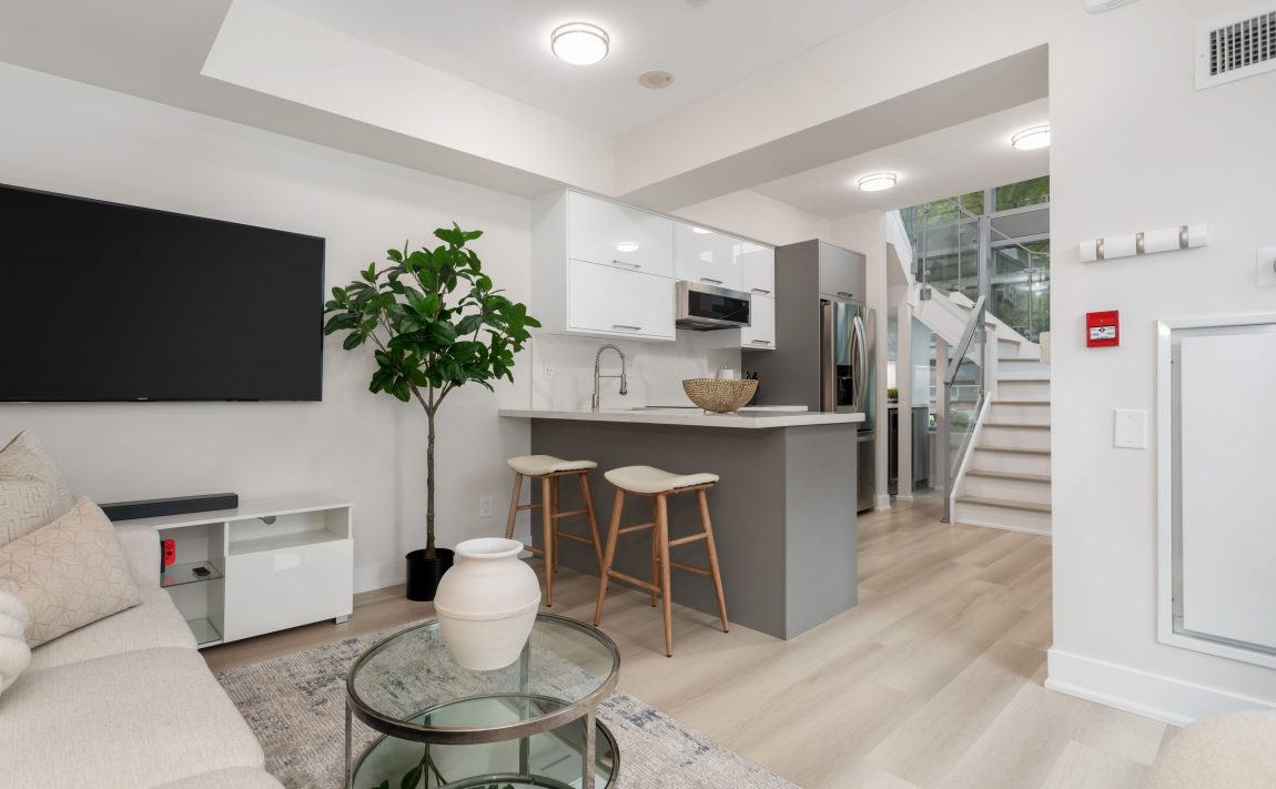 Step into this 870 sq ft luxury and extensively upgraded 1-bedroom + den, 2 bathroom condo townhouse, designed for those who appreciate modern elegance. The professional 2023 renovation showcases hardwood stairs with sleek glass rails, soaring 18-foot ceilings with two storeys of windows, and smooth ceilings throughout. The kitchen features quartz countertops, a double butterfly sink, all new appliances, a wine fridge, a soft-closing mechanism for cabinets, and a counter stovetop, perfect for the discerning chef. Enjoy spacious living with 7-inch wide vinyl flooring, while the large living room window leads to the front patio for outdoor relaxation. The custom-built walk-in closet in the bedroom is complemented by mechanical blackout blinds, and the ensuite includes a glass walk-in shower. Smart home features like two Nest thermostats, brand-new full-sized laundry appliances, and two EV charging stations make this home as functional as it is beautiful.